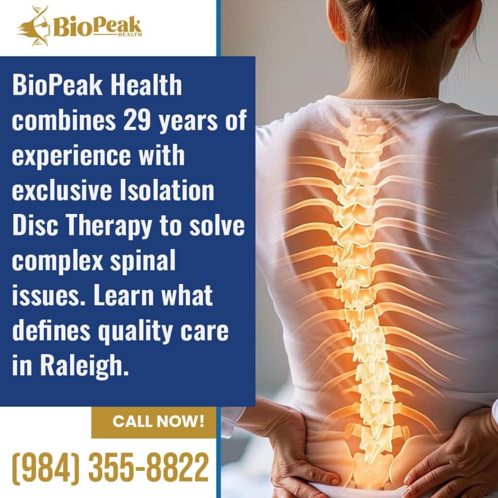 For residents throughout the Raleigh area seeking advanced chiropractic care, BioPeak Health offers unique advantages unavailable elsewhere in North Carolina. For patients with disc-related conditions, access to advanced spinal decompression therapy proves critical. We provide Isolation Disc Therapy for the precise treatment of herniated discs, bulging discs, and degenerative disc disease.